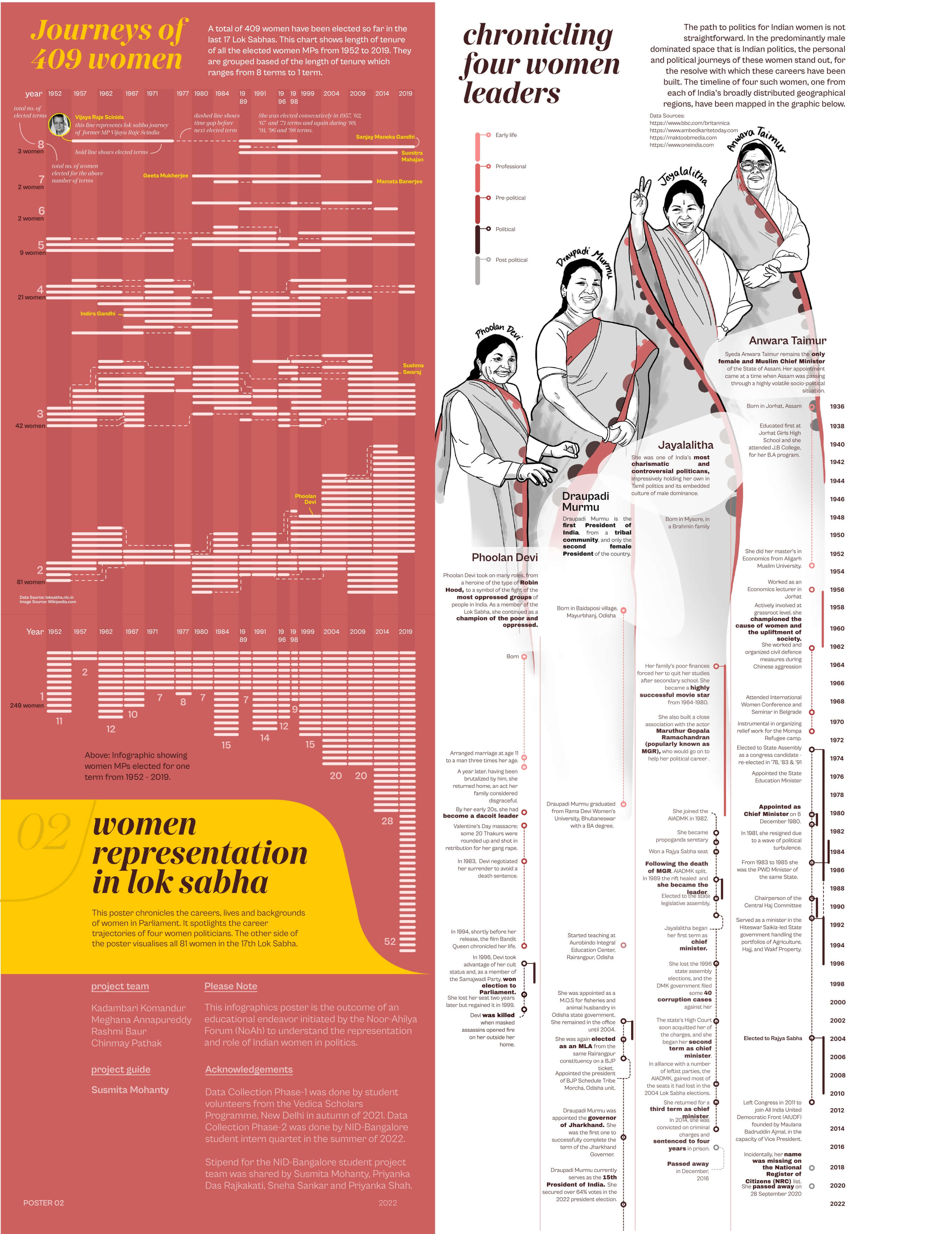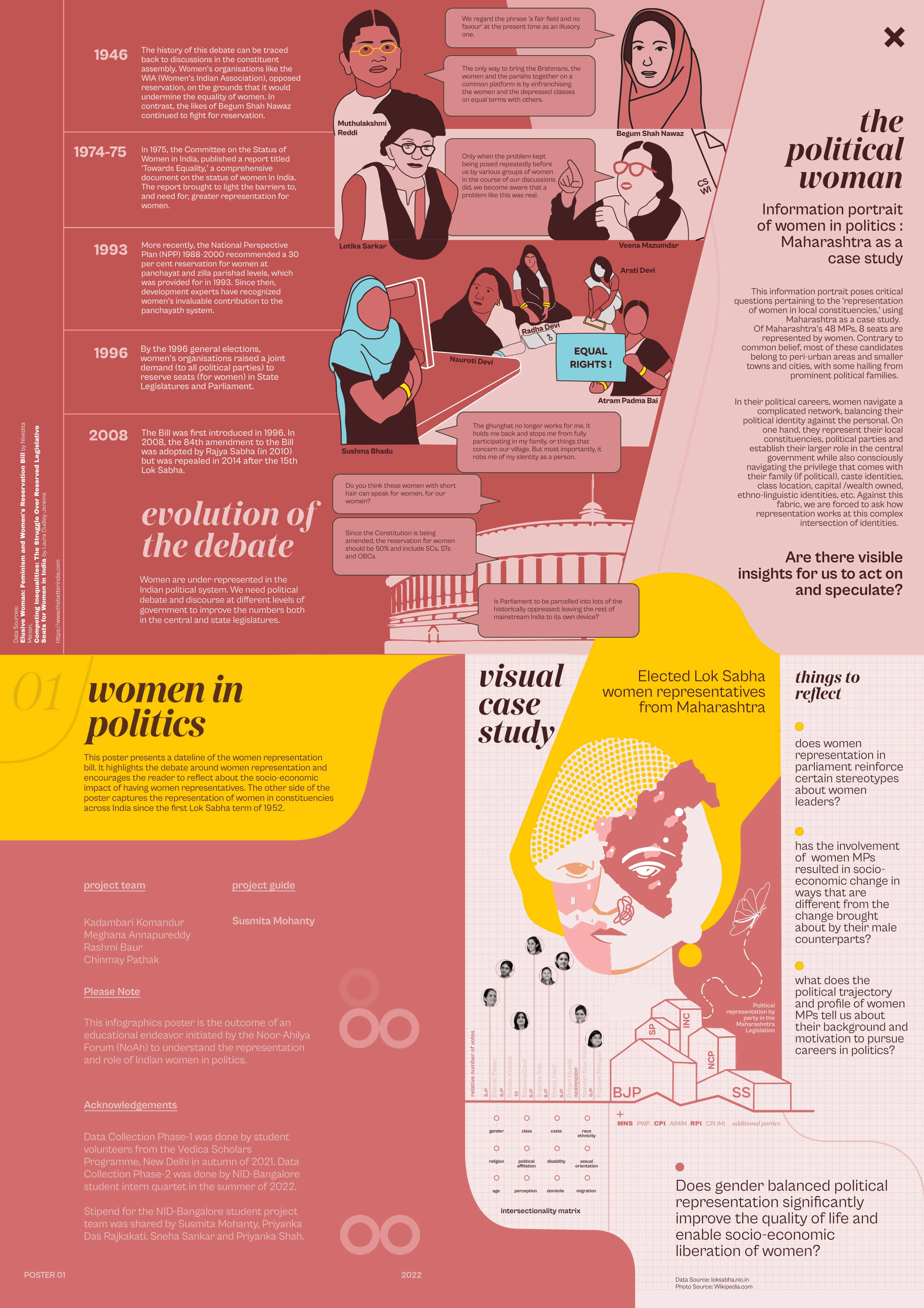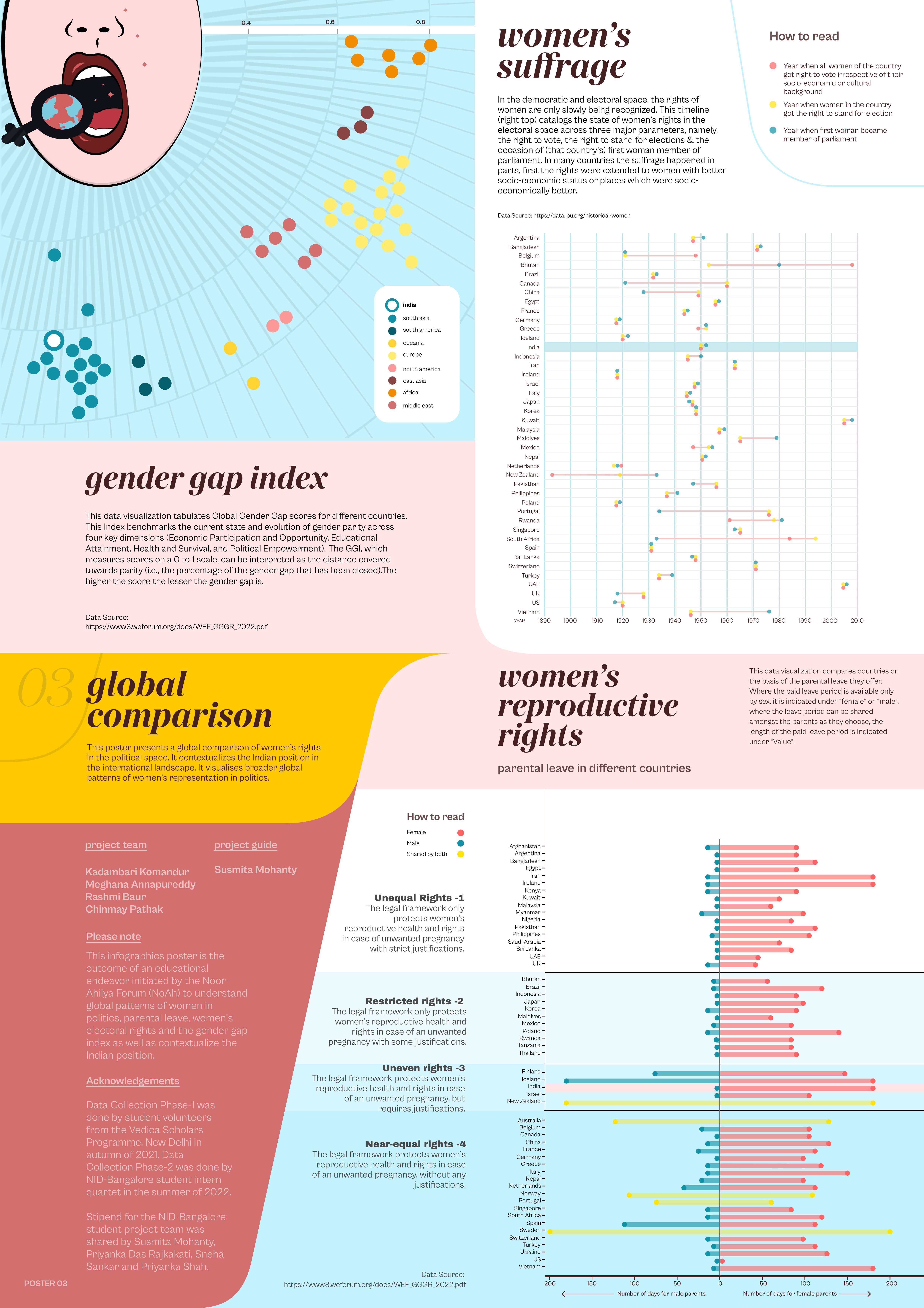 The outcome of the project was a set of three A2 size, double-sided infographics posters. Posters #1 and #2 focused on understanding the representation and role of Indian women in politics. Poster #3 highlighted global patterns of women in politics, parental leave, women’s electoral rights, gender gap index and contextualized it with respect to the Indian position.