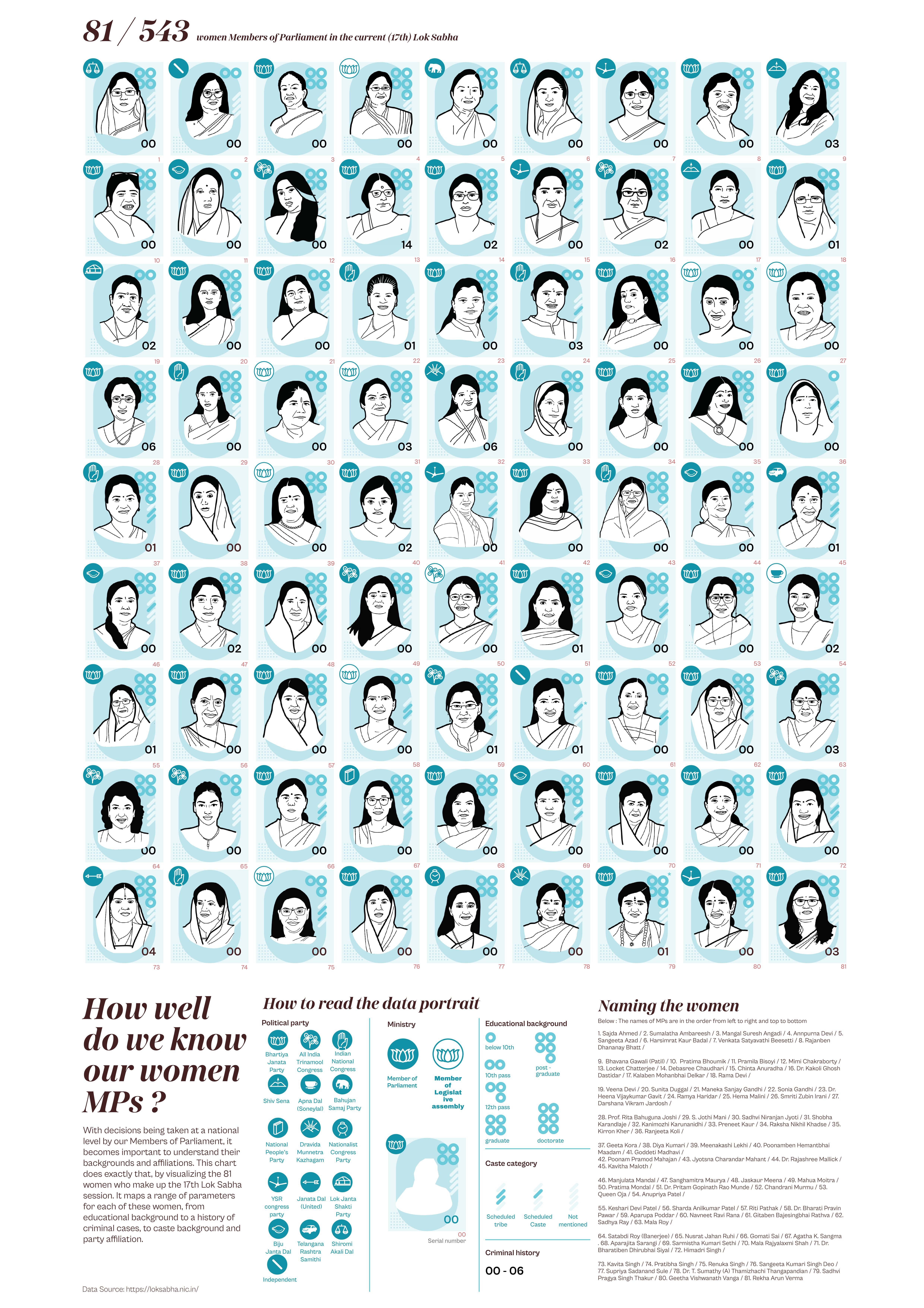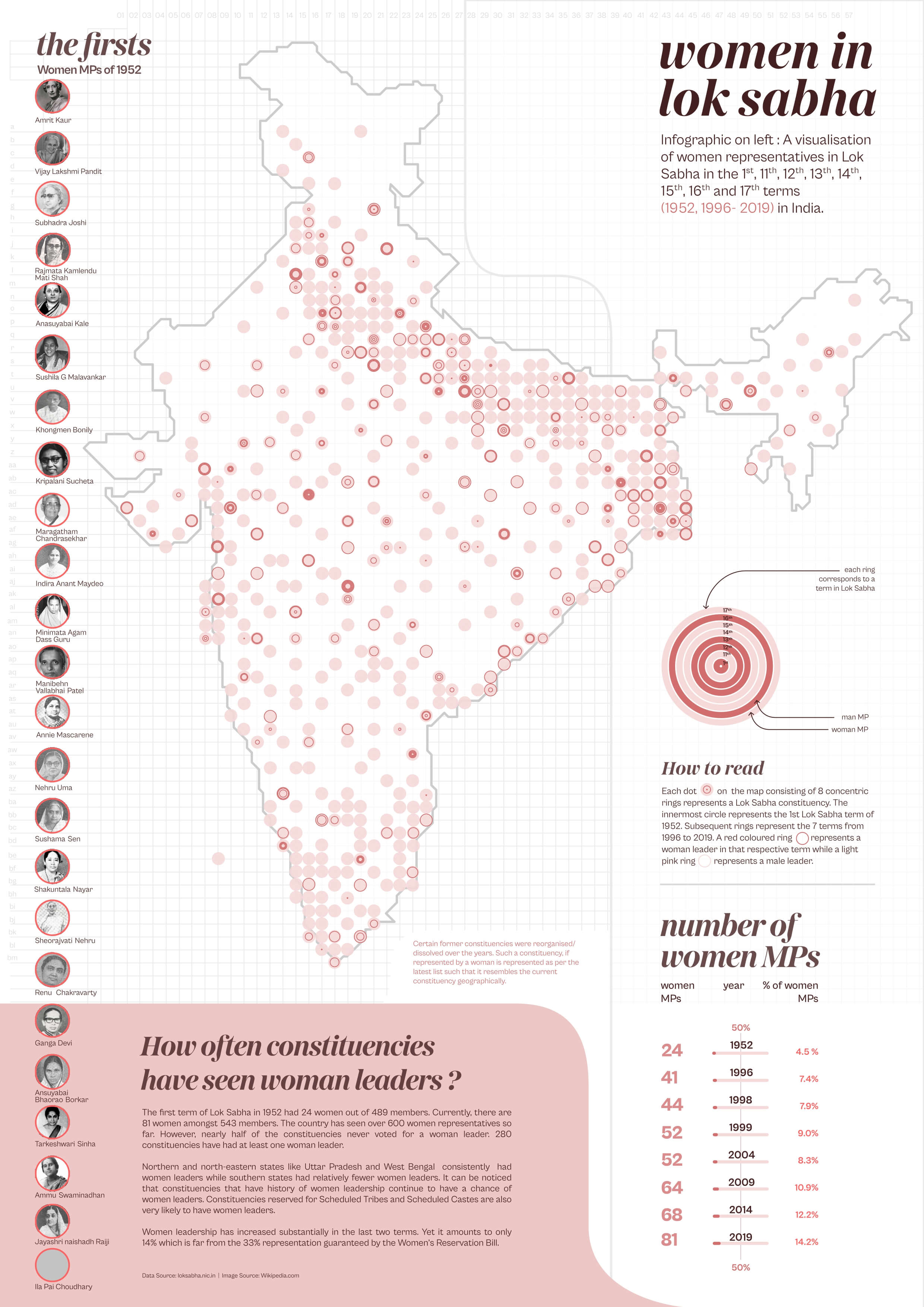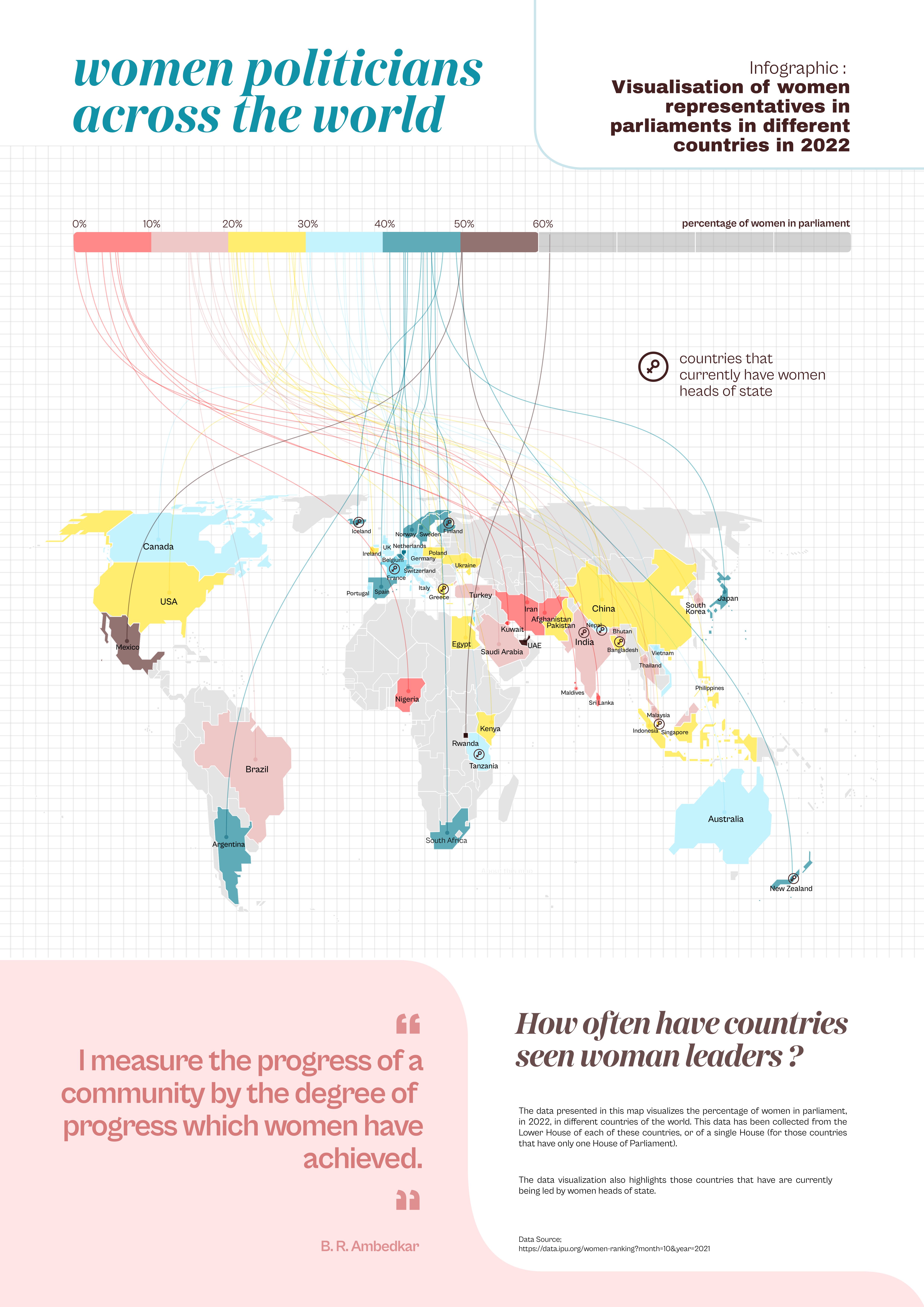 The outcome of the project was a set of three A2 size, double-sided infographics posters. Posters #1 and #2 focused on understanding the representation and role of Indian women in politics. Poster #3 highlighted global patterns of women in politics, parental leave, women’s electoral rights, gender gap index and contextualized it with respect to the Indian position.